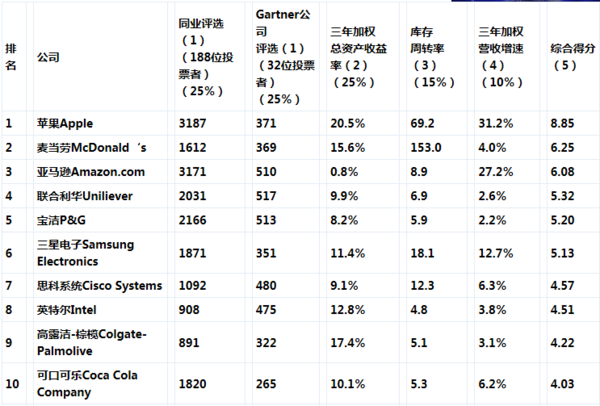首先我們看一下2014年全球供應鏈運營管理的公司有哪些,排在前頭的是蘋果,綜合評分8.85,第二位麥當勞公司。